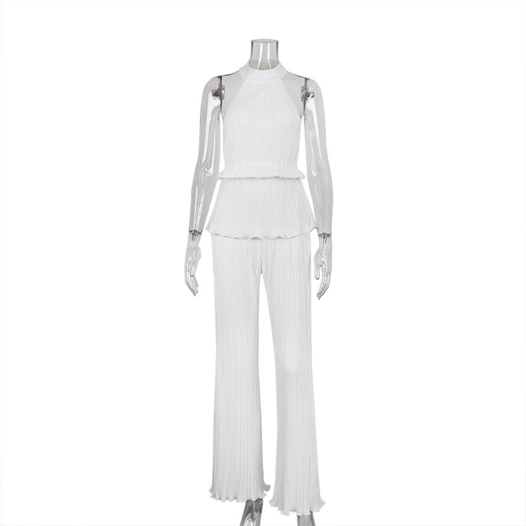 Backless Sleeveless Vest White Pleated High Waist Wide Leg Pants Suit