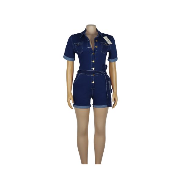Blue Short Sleeve Shorts Rompers Fashion Elastic Lapel Button Slim Fit Jumpsuit Ladies Vestidos