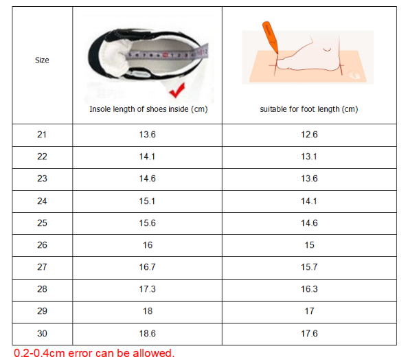 | Shoe size | 21, 22, 23, 24, 25, 26, 27, 28, 29, 30 |