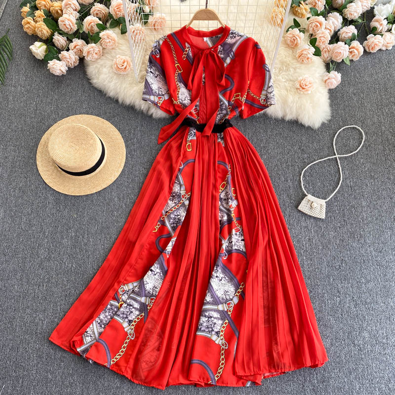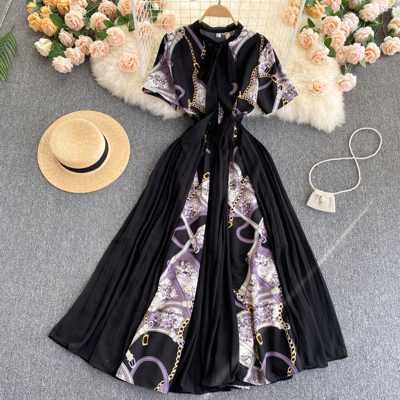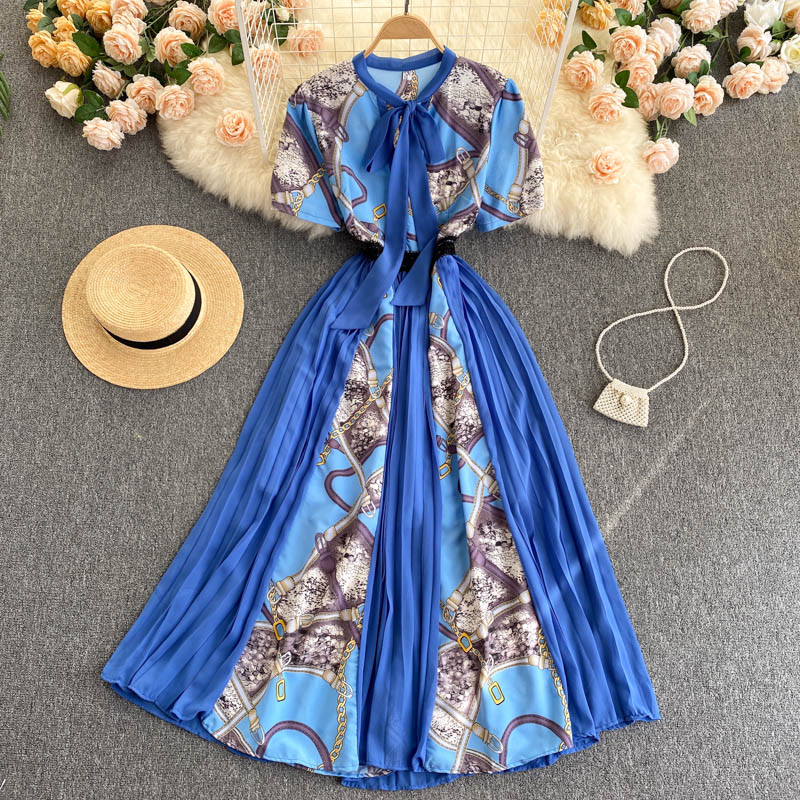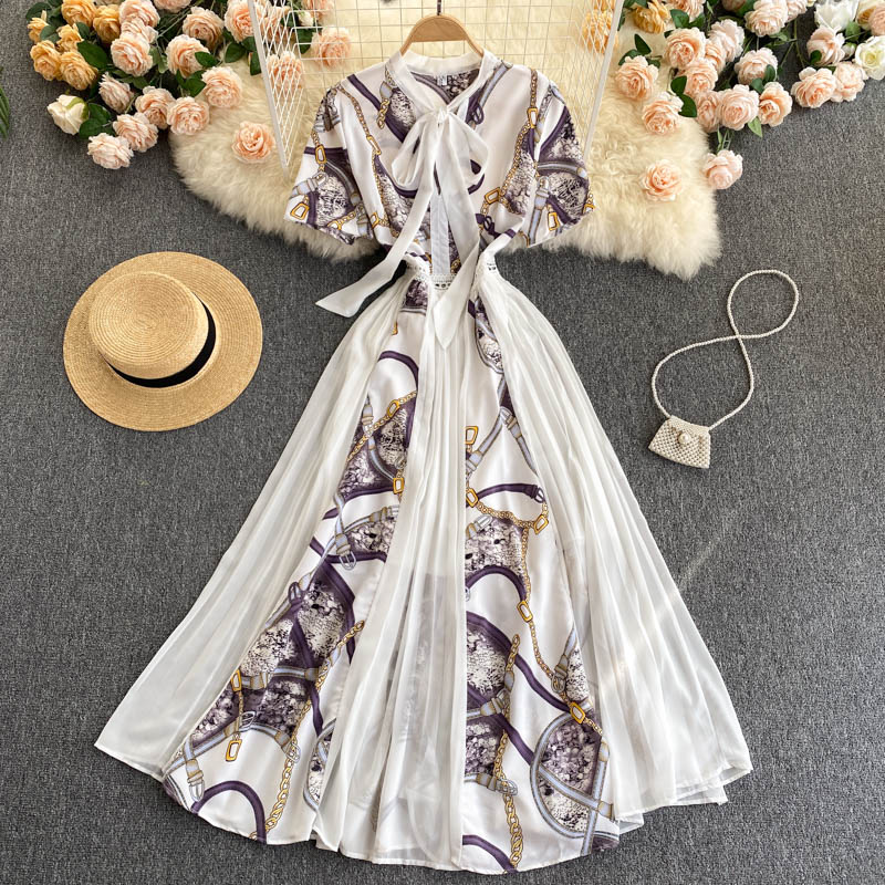 European And American Ins Design Sense Niche Printed Puff Sleeves Elegant Lace Bow Knot Color Matching Printed Long Dress