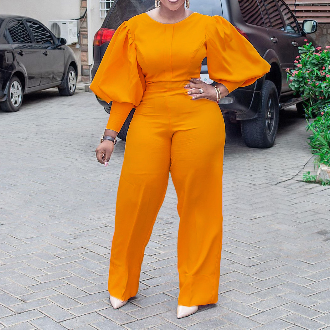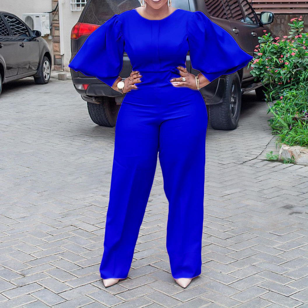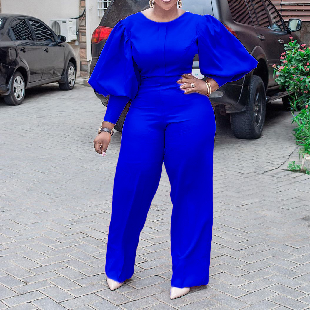 High Waist Straight Leg Solid Color Lantern Sleeve Jumpsuit