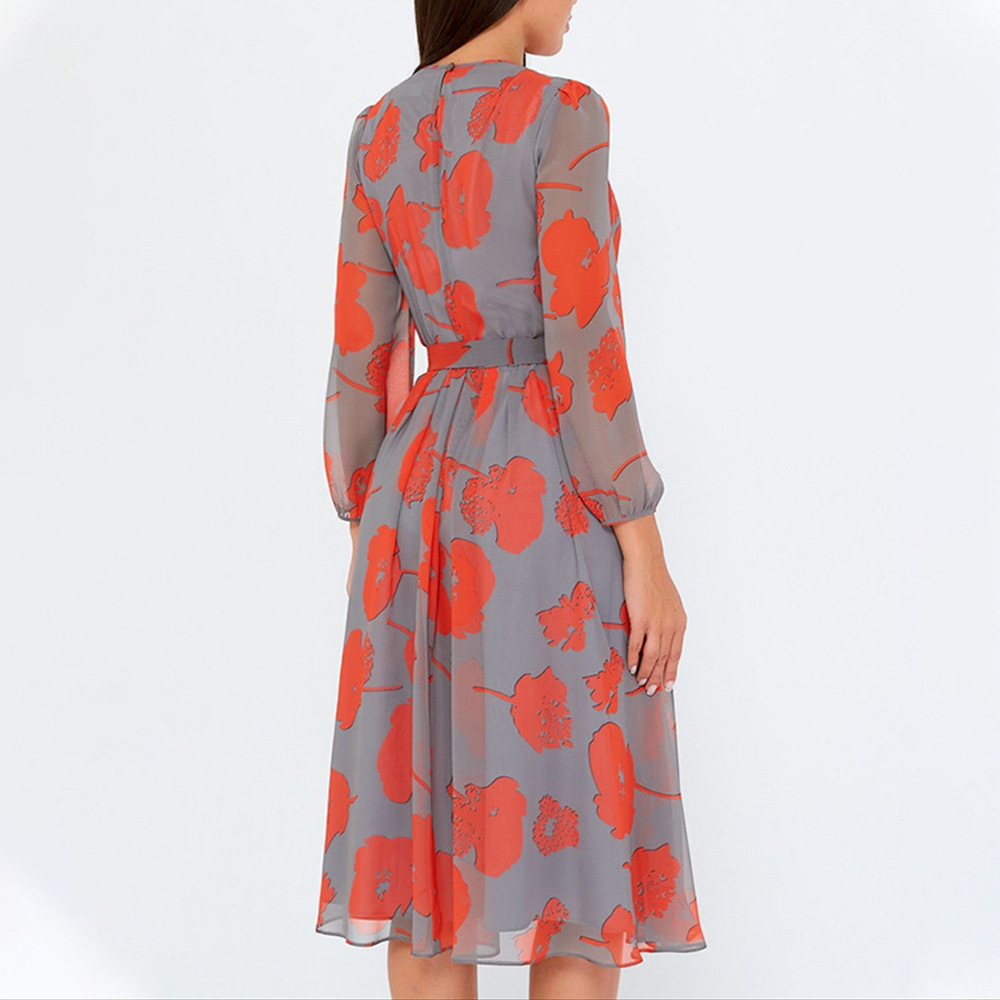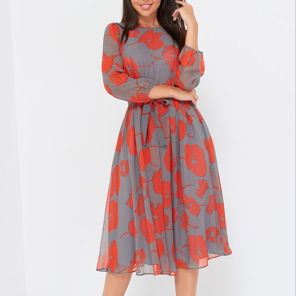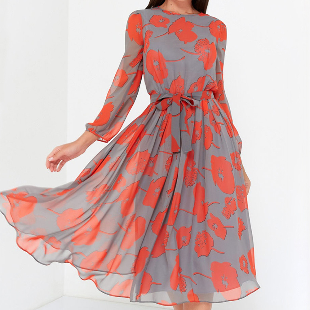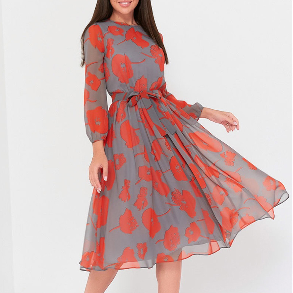 Mid-Length Skirt Red Print Temperament Commuter Mid-Waist Crocheted Belt Dress