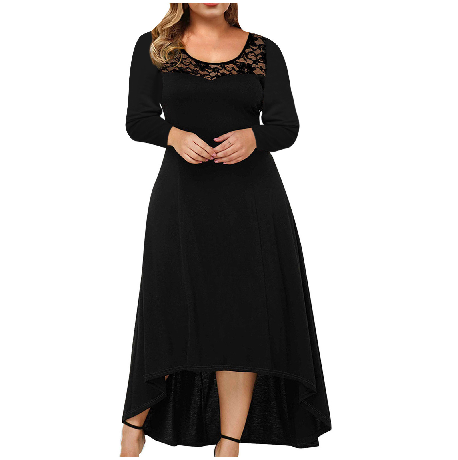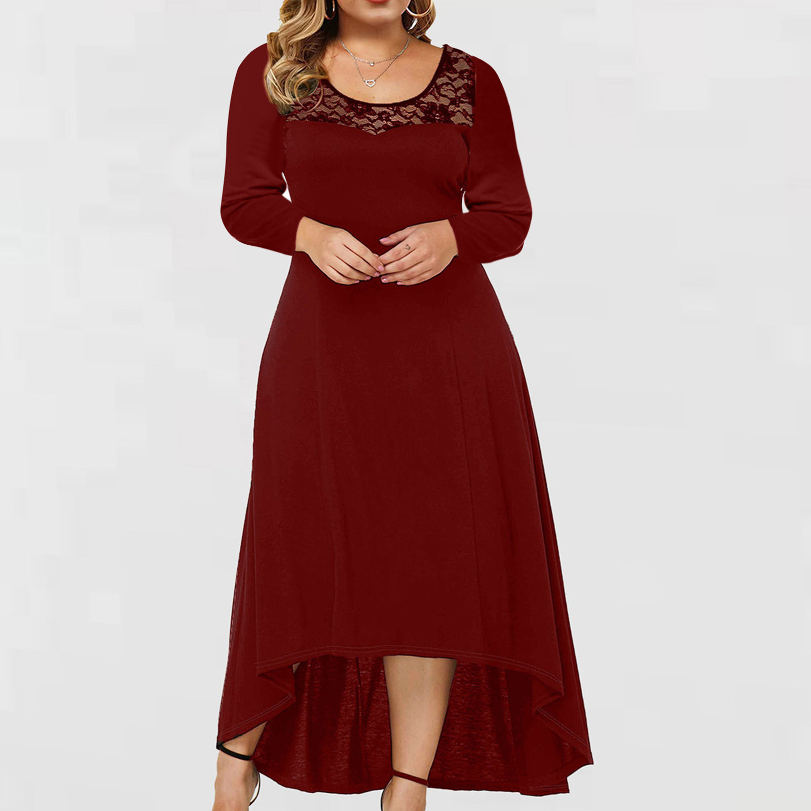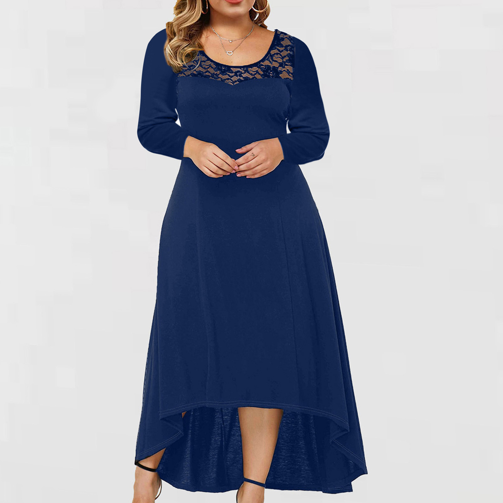 Round Neck Lace Stitching Irregular Hem Long Sleeve Dress