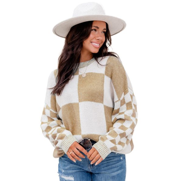 Tags: checkered print, checkered print swaeter, long sleeve sweater for women, plaid block color, Sweater, thick sweater, Women sweater