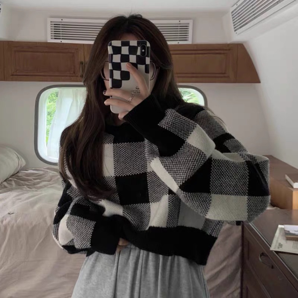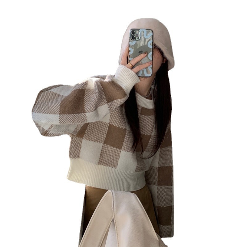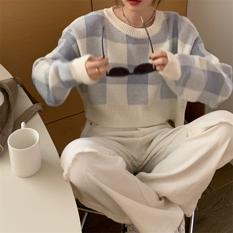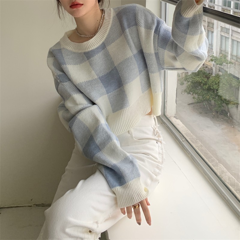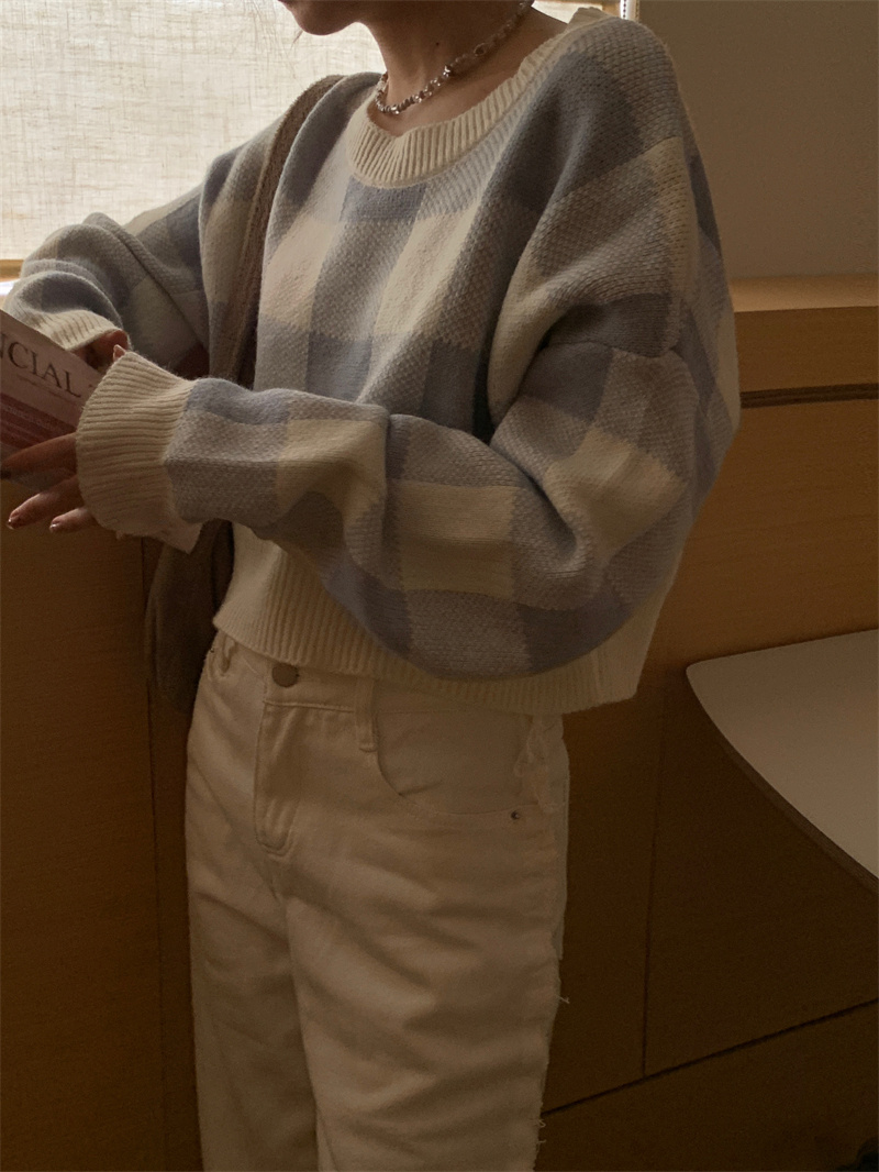 Women’s Contrast Color Plaid Sweater Short Slim